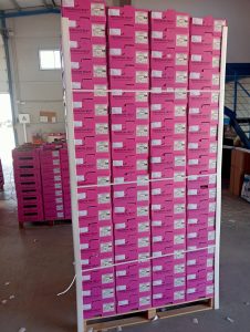 Para los envíos, utilizamos palet europeo con un total de 136 cajos por palet, o palet industrial, con 170 cajas por palet.